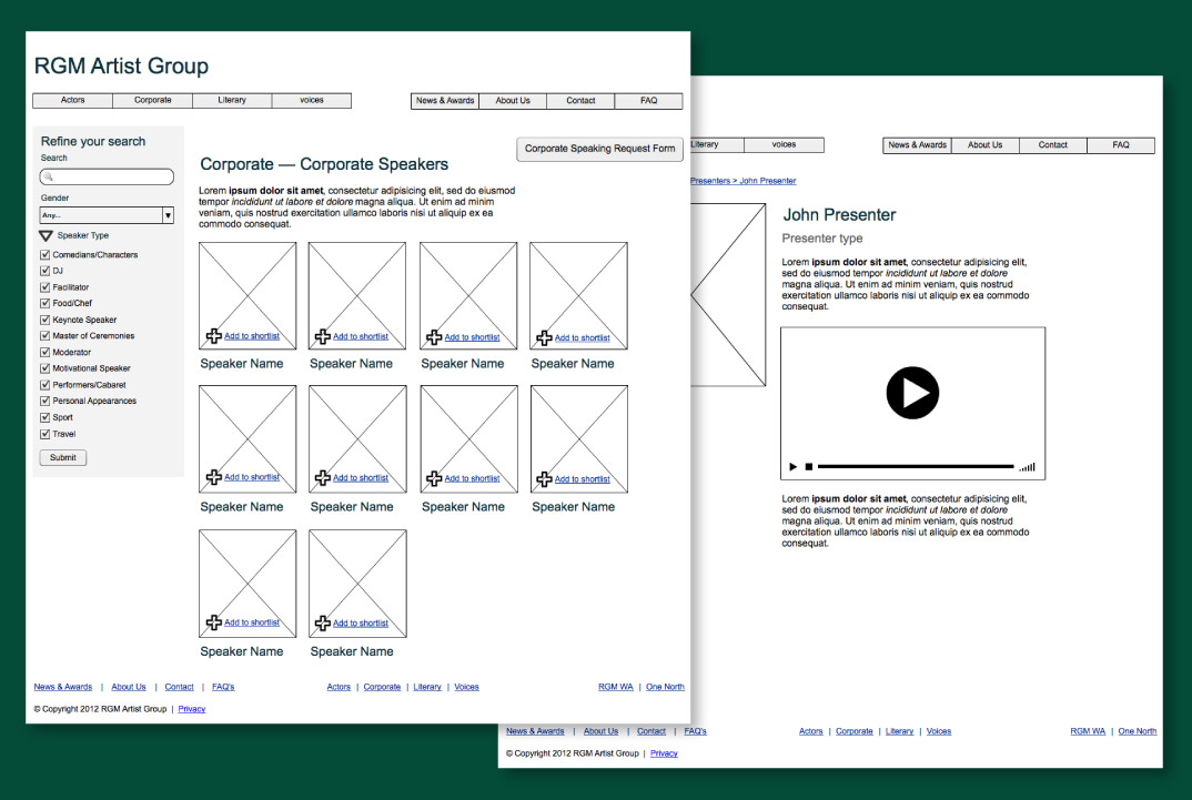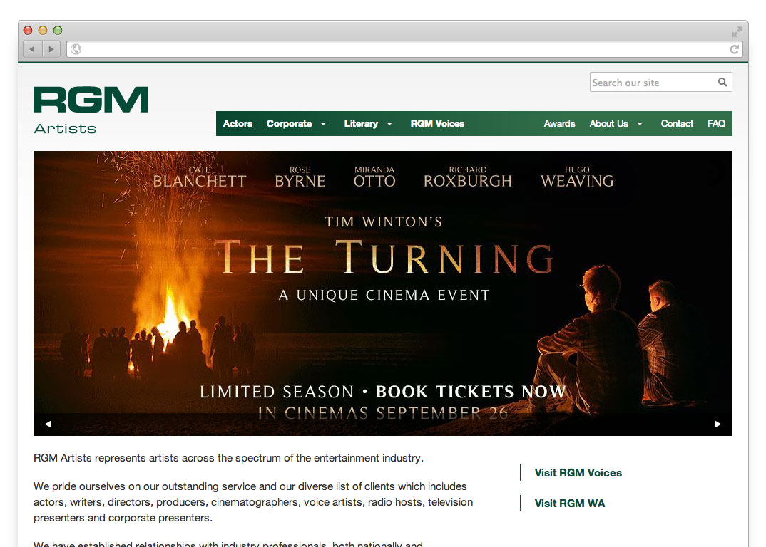 RGM Artists represents Australia’s best known actors, voice artists, writers, corporate presenters and more. They required smart, functional websites for three divisions, RGM ArtistsRGM Voices and RGM Western Australia. The sites needed to adhere to an existing brand aesthetic, and convenience and efficient navigation were important. The sites needed to be clear and unpretentious, both professional and human.