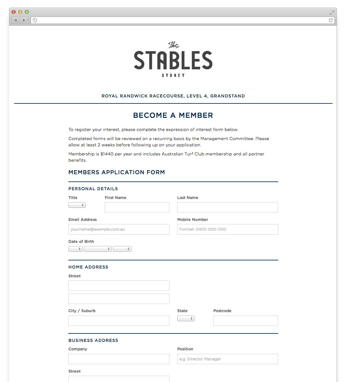 The Stables is an exclusive membership program endowed by a partnership between The Australian Turf Club and The Keystone group, and based in the expansive Level 4 Member’s Stand at Royal Randwick Racecourse. The brief was to devise an online application process that would reflect the luxury experience new members could come to expect from the venue.